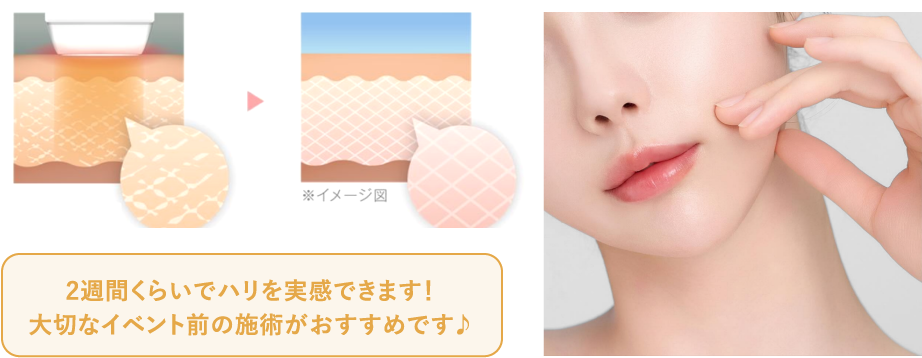 ファームアップとは、近赤外線の波長域の光を用いた顔のタイトニング・たるみ治療のことです。近赤外線(ピーク波長:1300nm)は水分吸収率が高く、皮下(2〜3mm)の水分に作用し真皮層で熱エネルギーを発生させることができます。熱エネルギーがコラーゲン収縮を引き起こし、線維芽細胞が活性化されることでコラーゲン生成を促進! 温かいマッサージのような感覚です♪